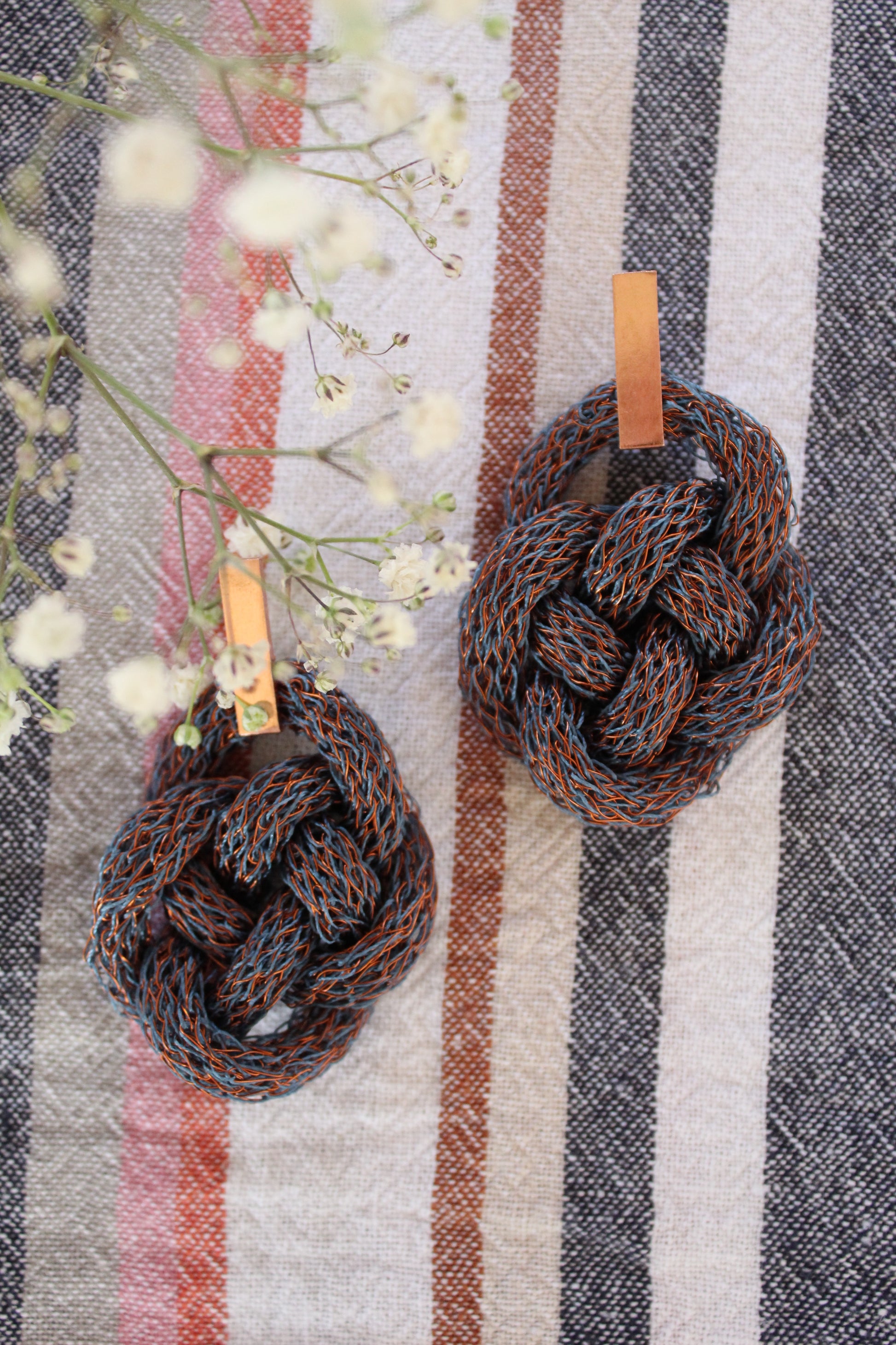 Aros tejidos en alambre de cobre e hilos de colores.