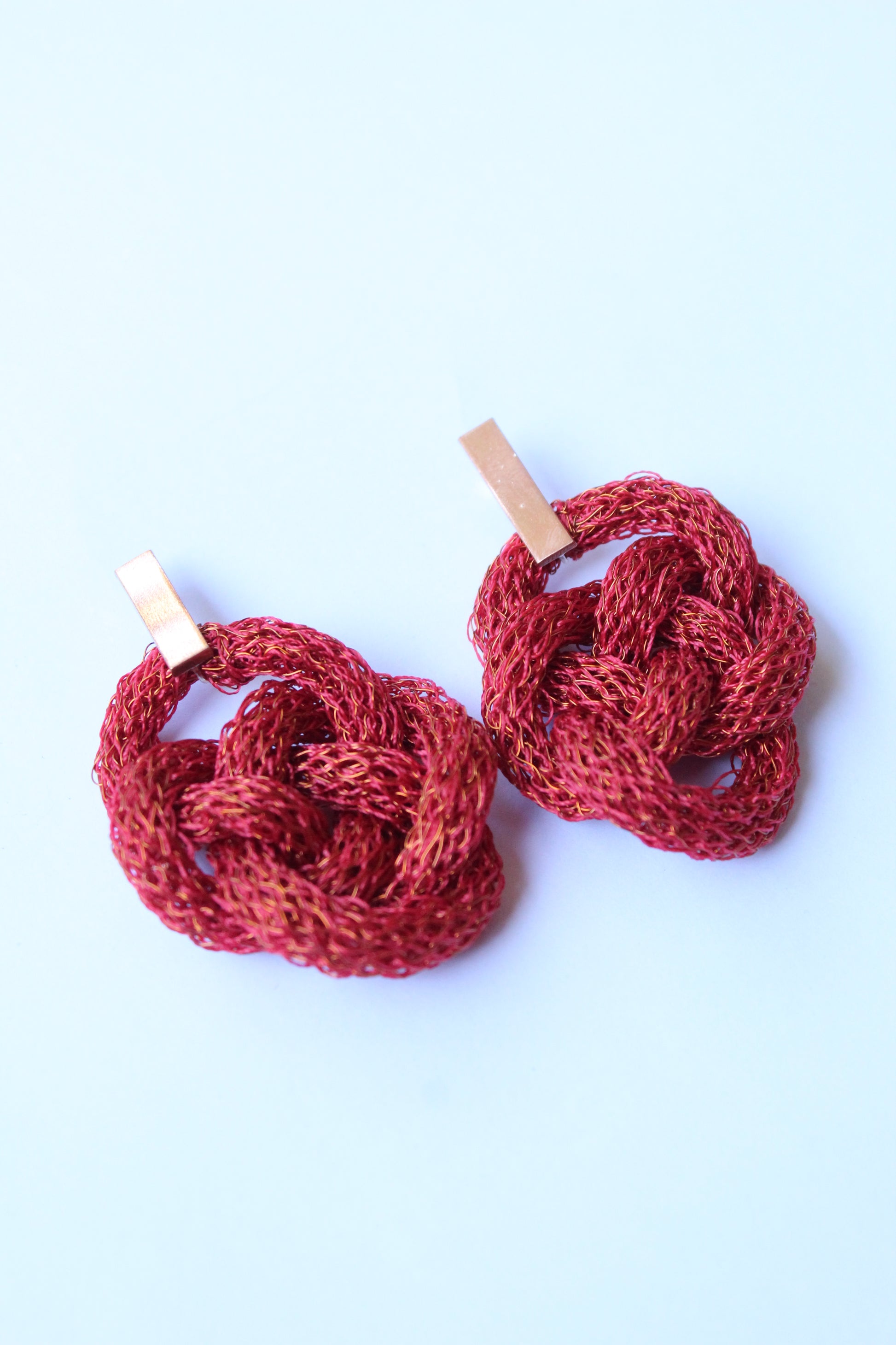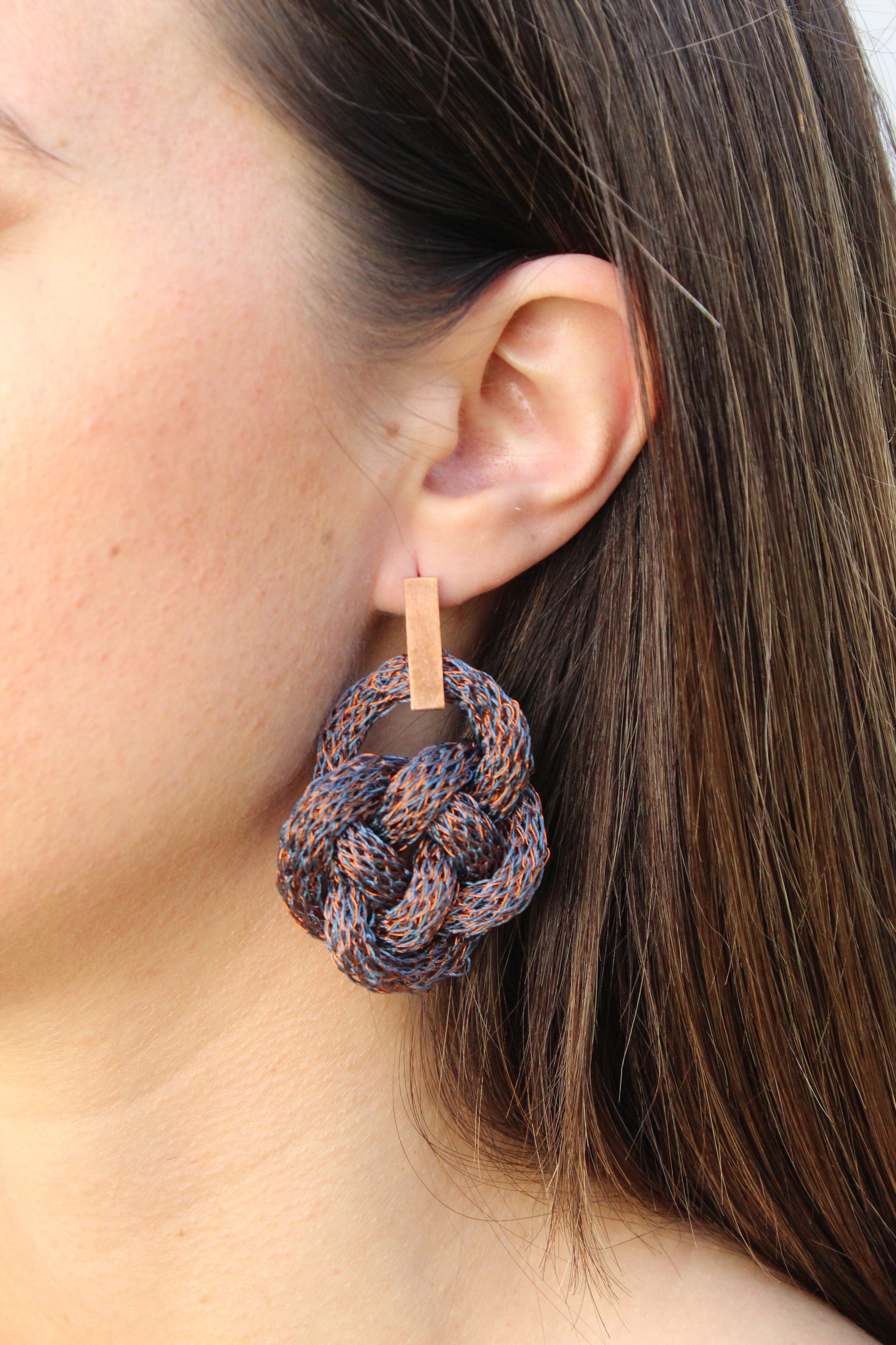 Nuestras piezas son tejidas en alambre de cobre esmaltado lo que evita que cambien de color o se oxide, sólo las argollas en las terminaciones pueden cambiar de color con el tiempo y se limpian fácilmente con jugo de limón.