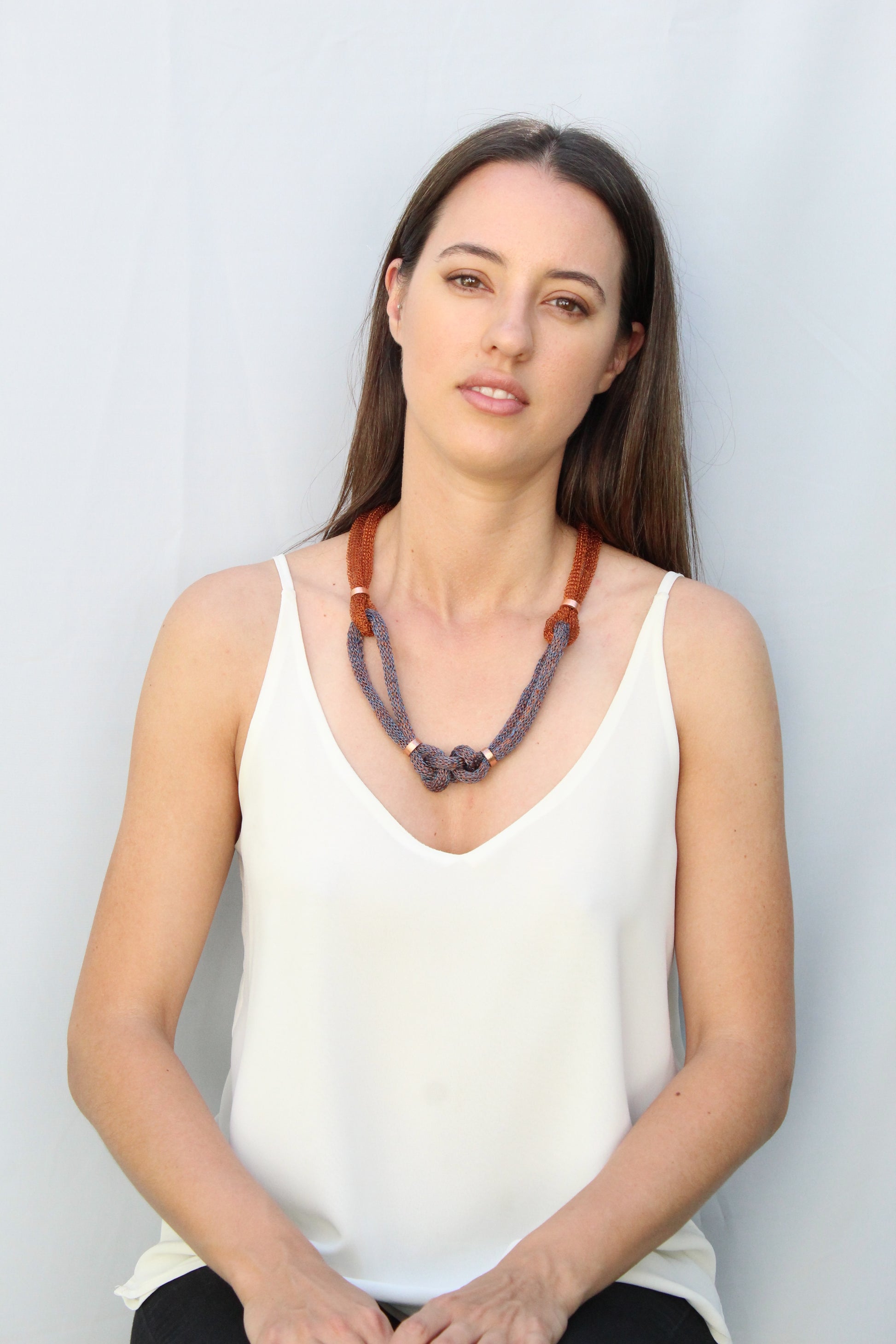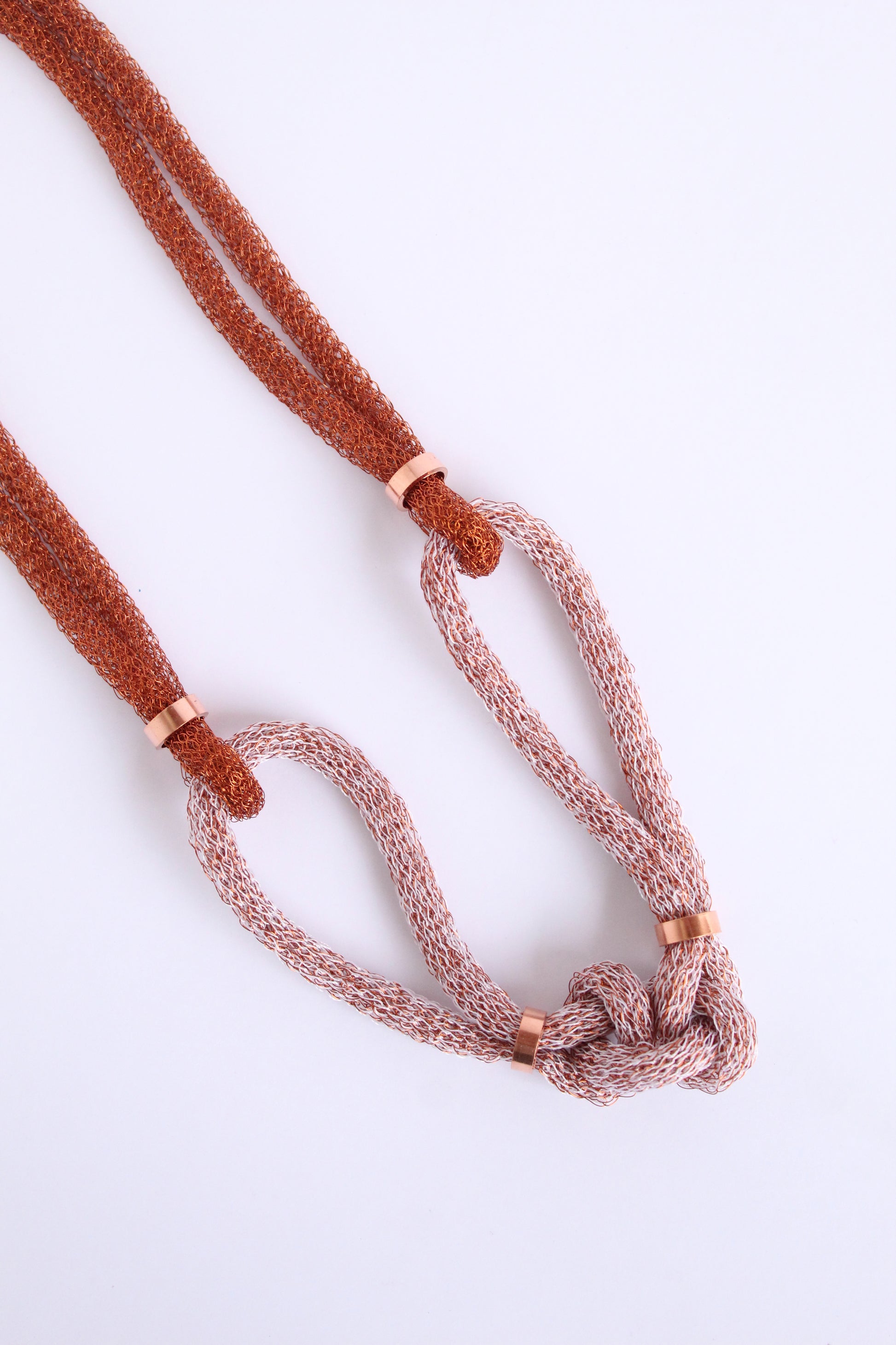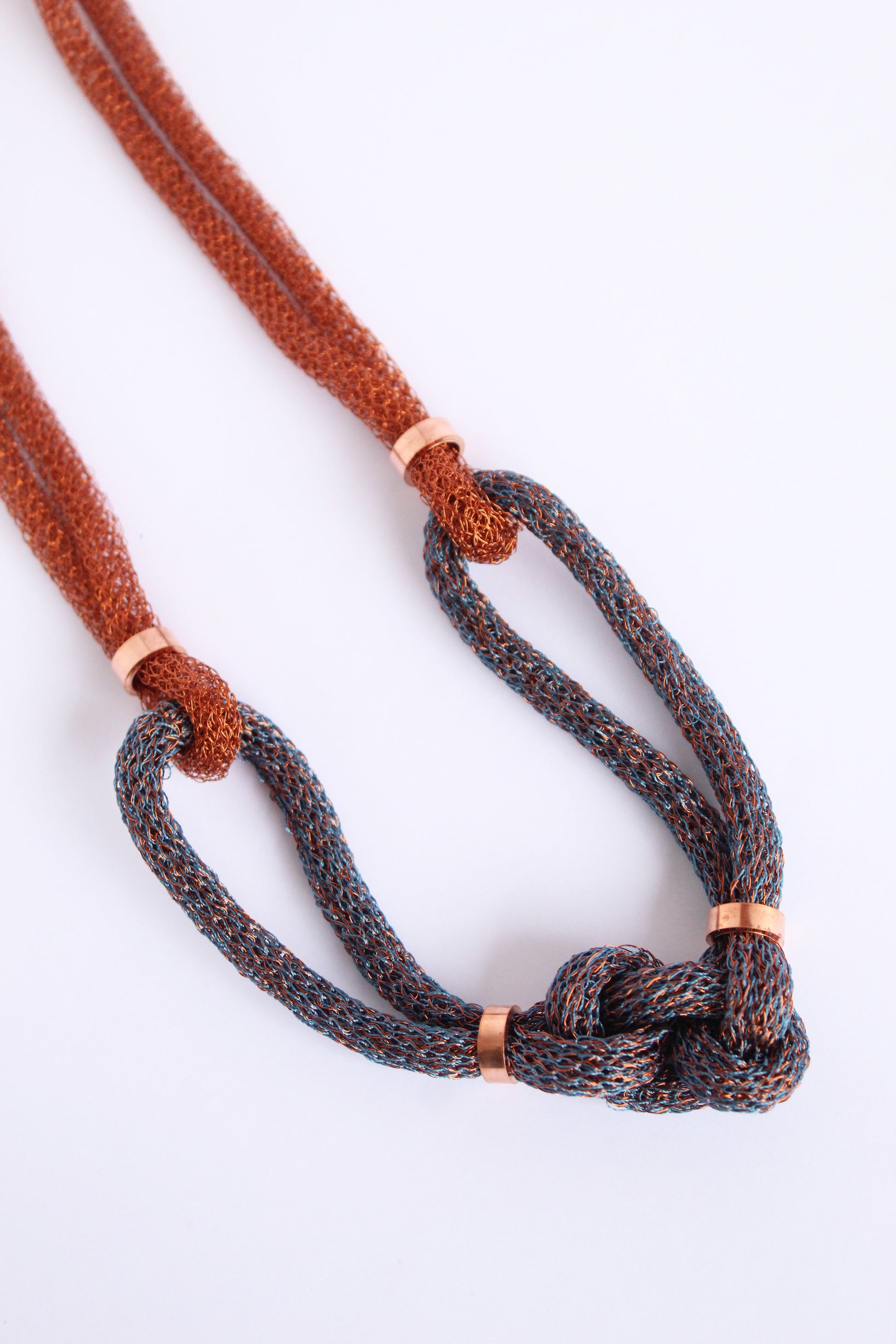 Collar tejido en alambre de cobre e hilo. Los cordones tejidos se unen a través de la aplicación de anillos de tuberías de cobre y un nudo que pende del medio dando forma a la pieza.