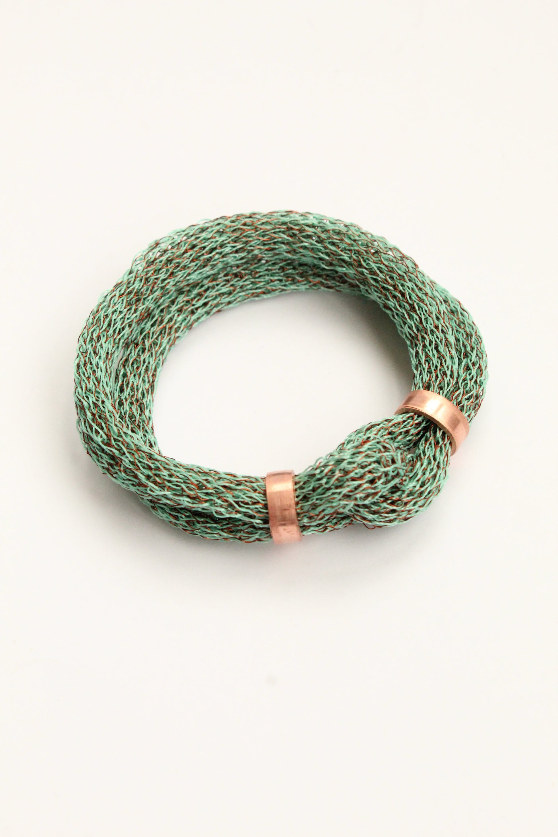 Pulsera tejida en alambre de cobre e hilo, un cordón doble que se mantiene unido con la aplicación de un anillo de tubería de cobre fijada con costura echa a mano.