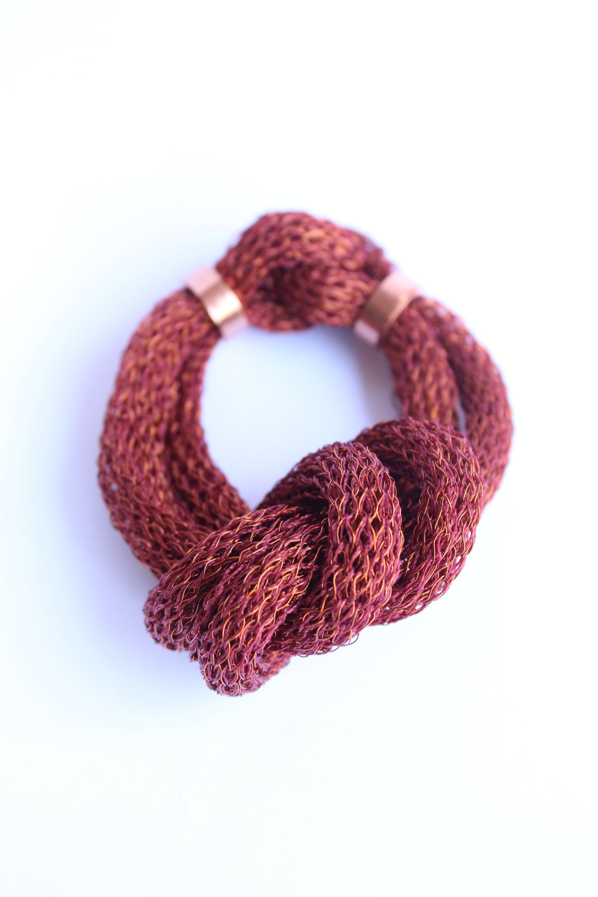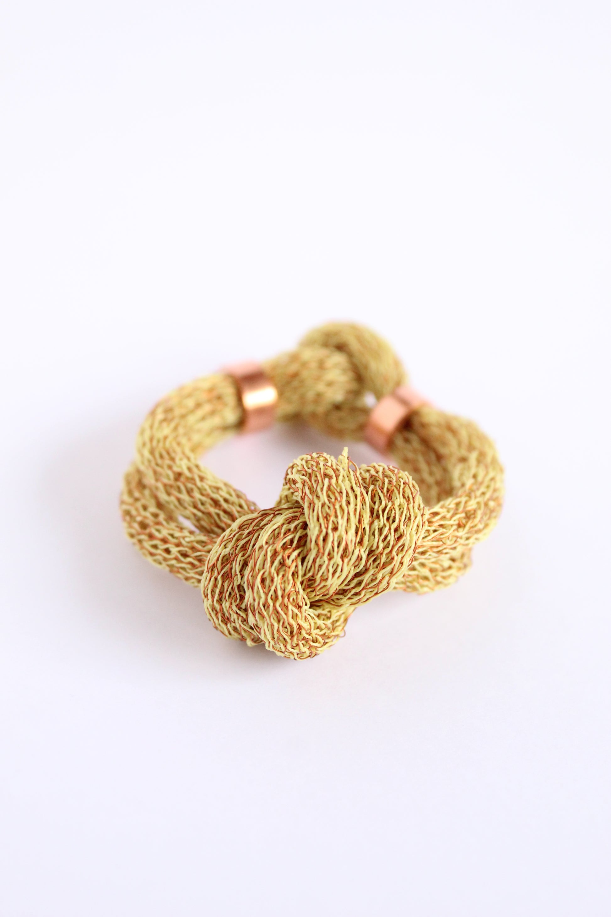 Pulsera tejida en alambre de cobre e hilo con un nudo simple al centro. Los extremos se unen utilizando un anillo de tubería de cobre fijada con una costura hecha a mano.